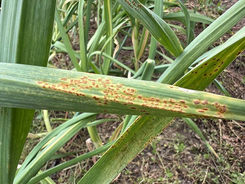 ニンニクを観察していたところ、「さび病」が発生している個体を発見。