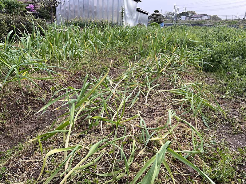 これだけならそんなに問題は無いのですが、雑草がニンニクを巻き込み自重で倒れてしまったのです。