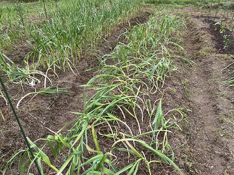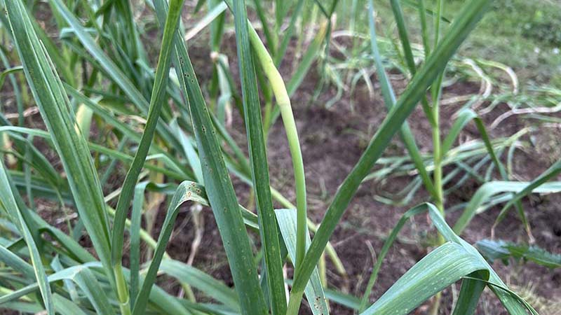 トウ立ちしたニンニクの芽(花茎)は放置すると花が咲いて実が大きくならないので、見つけ次第早めに切り取ります。